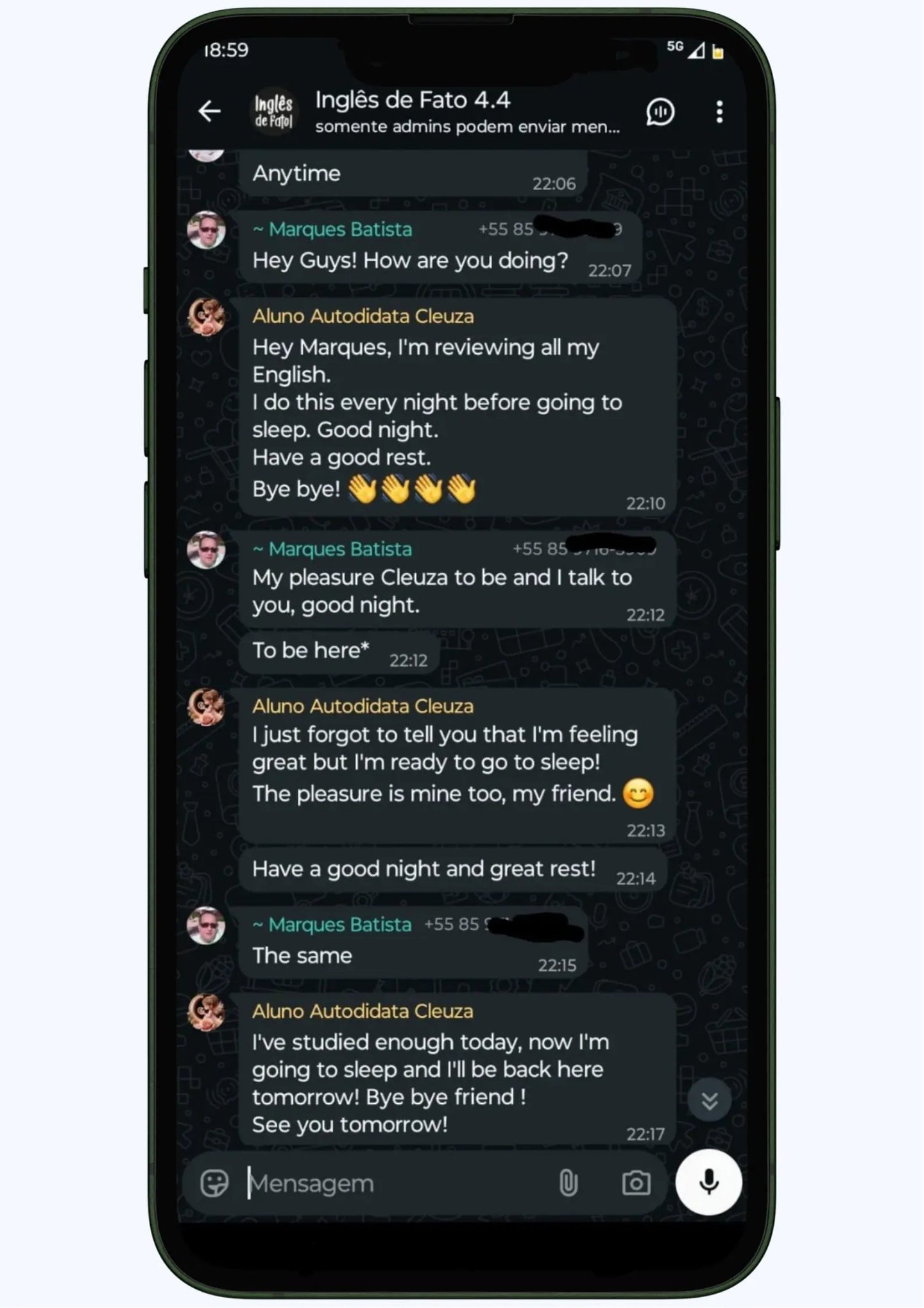 Todos os alunos têm acesso ao grupo VIP no WhatsApp para networking e troca de experiências. É um espaço exclusivo para interação com outros estudantes, compartilhamento de dúvidas e aprendizado complementar, mantendo o ambiente organizado para evolução no inglês.