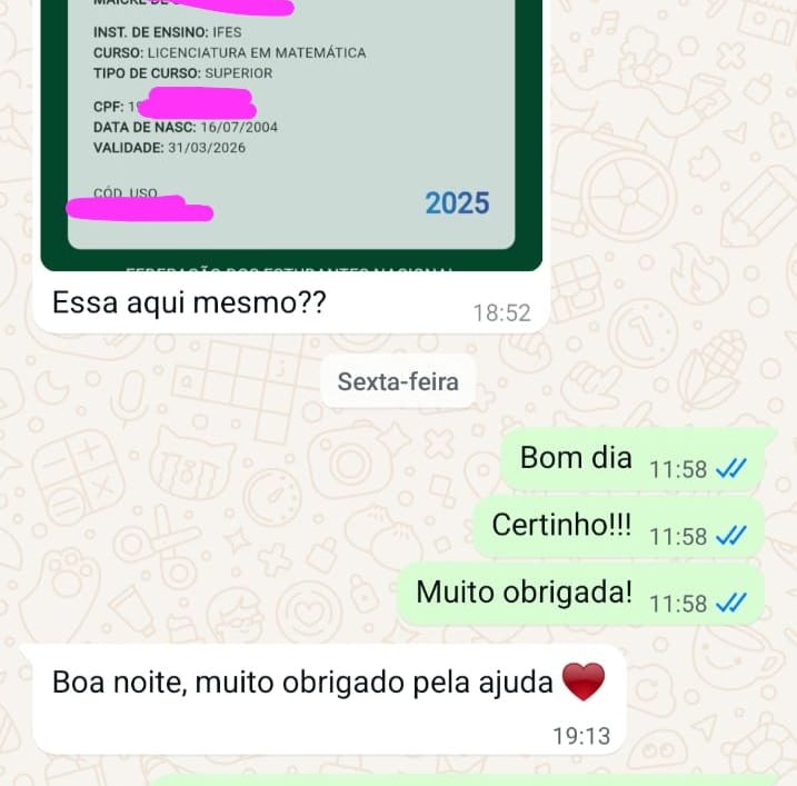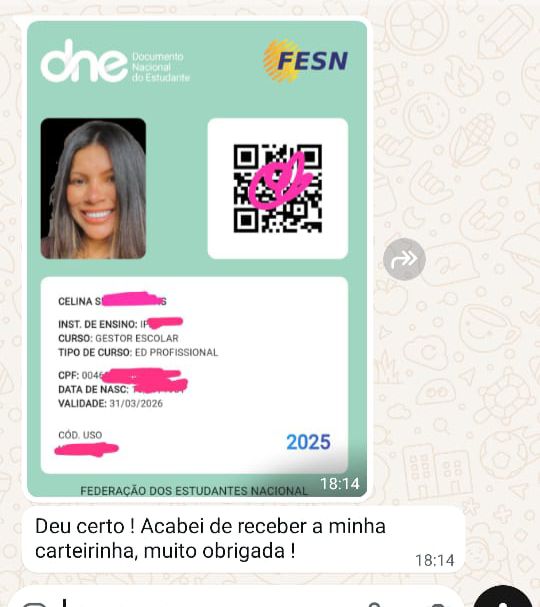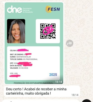 Depois do pagamento, basta enviar seu RG e comprovante de matrícula para finalizar a emissão do seu DNE Digital.